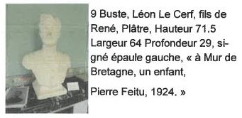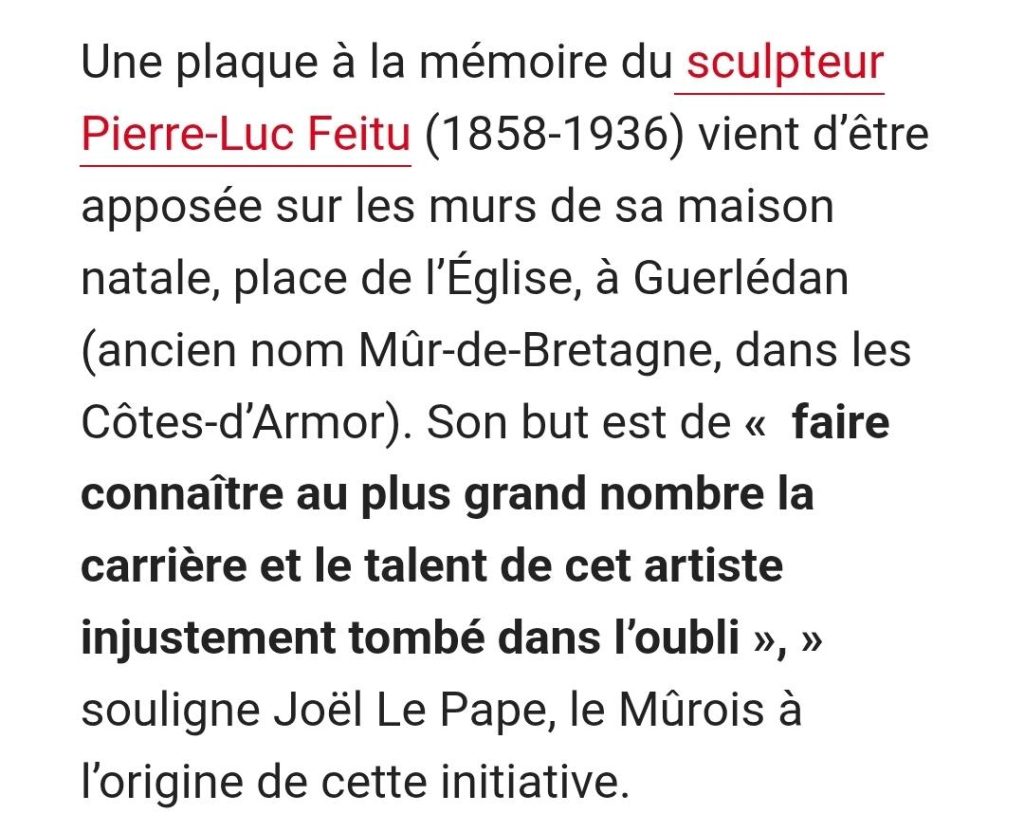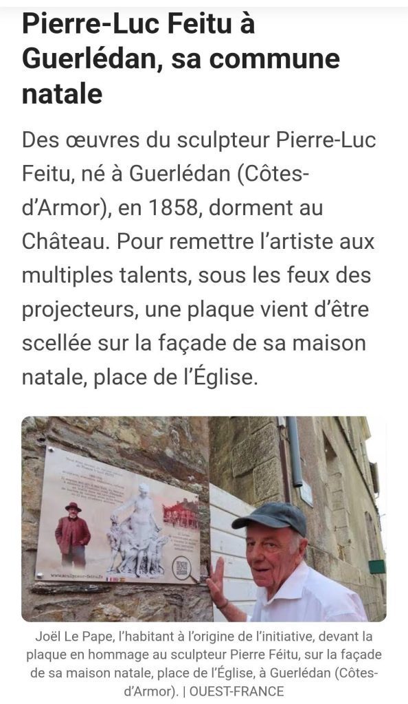 – Nous adressons également nos remerciements à la Mairie de Mûr-de-Bretagne (en particulier à madame Coz) et à toutes les personnes qui nous ont aidés et nous aident encore à perpétuer la mémoire de Pierre Feitu, en œuvrant à la recherche de solutions pour assurer la restauration, la conservation et la mise à disposition du public des statues encore présentes au château Le Cerf situé à Mûr-de-Bretagne, commune natale très chère au cœur de l’artiste .