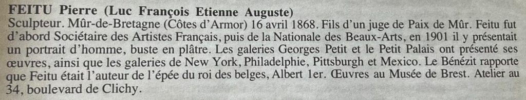 Selon Louis Ténars, auteur du livre « Le sculpteur Pierre Feitu », ce sculpteur breton à « face de faune » est bon vivant, joyeux compagnon, plein de verve, maniéré et poli. Son histoire est rocambolesque.