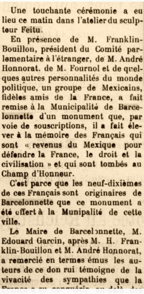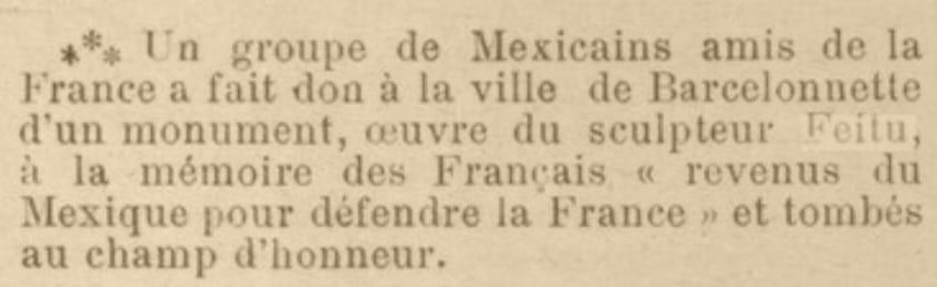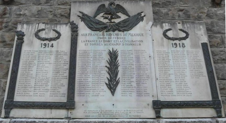 PLAca COnMeMORATIVa INAUGURada el 19 de Agosto de 1923 en homenaje a los 241 FRAnceseS que REgresaron De mÉXIco con el fin de participar a LA PRiMera gUERRa MuNDIAL