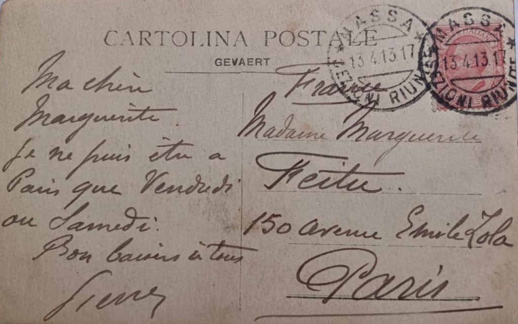 TARJETA POSTAL ENVIADA DESDE MASSA, CERCA DE CARRARE, A MARGUERITE, LA MUJER DE SON HERMANO Étienne