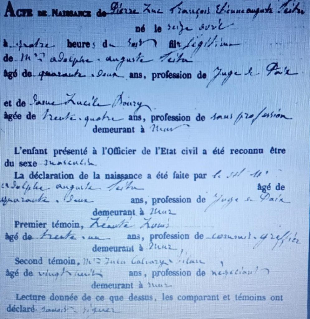 Birth certificate of Pierre (-Luc, François, Étienne Auguste) Feitu